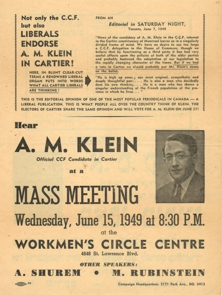 From 1932 to 1955, Klein was editor of the Canadian Jewish Chronicle and addressed subjects such as Nazism in Europe, Canadian Jewish social issues, and Zionism. In 1939, he began a long professional relationship with Samuel Bronfman and the Canadian Jewish Congress, working as a speechwriter and public relations consultant during one of the most critical moments in Canadian Jewish history, when the Congress was fighting domestic antisemitism as well as trying to save the Jews of Europe from Nazi oppression. In the midst of this busy period, Klein published in 1940 his first collection of poems entitled, Hath Not a Jew.
