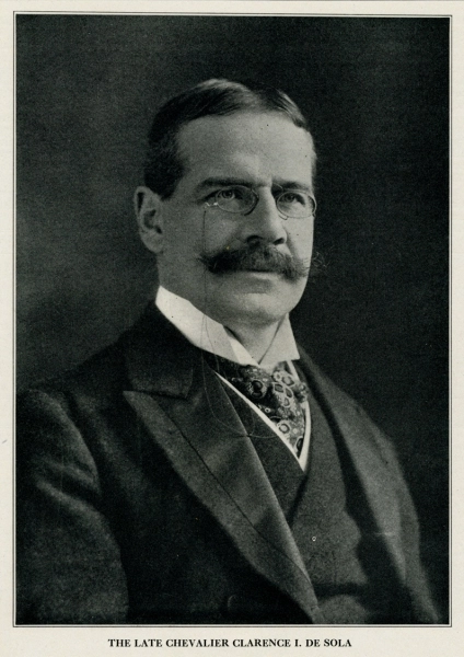 Clarence de Sola (1858-1920), business tycoon, eminent Zionist, and de facto leader of the Canadian Jewish community, was born in Montreal in 1858. He was the third son of the famous British-Canadian rabbi, Abraham de Sola, leader of Montreal’s oldest synagogue, the Shearith Israel, and Esther Joseph, daughter of Henry Joseph, the patriarch of one of Canada’s most successful Jewish families. Clarence was raised in a privileged environment in the Golden Square Mile, playing lacrosse and football at the High School of Montreal, and hobnobbing with the children of the city’s Protestant and Jewish establishments. De Sola was known in high school as Historicus, for his love of history. As a young man, de Sola went into the produce business with his brothers. He soon began to climb the ladder of success, doing business with British shipbuilding interests and Belgian steel manufacturers, among many others. Close ties with the Liberal government of Wilfred Laurier helped de Sola’s economic interests, and his business connections with Belgium led to that country appointing him its Consul General in Montreal in 1905.