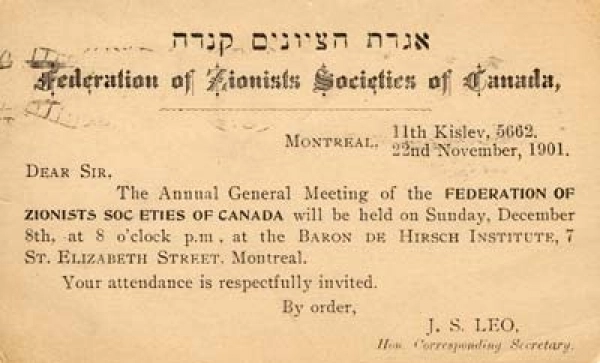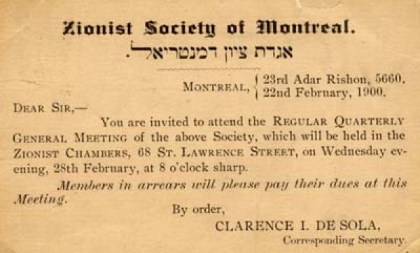 Drawing on the rich de Sola heritage – and that of all Spanish and Portuguese Jews, at an early age, de Sola became actively involved in Montreal Jewish communal life, helping establish a local chapter of the Anglo-Jewish Association to help refugees fleeing pogroms in Russia. Shortly after the first Zionist International Congress in 1897, de Sola was appointed president of the Federation of Zionist Societies of Canada, a position he held until 1919. The chief promoter of the Zionist cause in Canada, de Sola was in touch with other Zionist leaders from around the world, including Theodore Herzl, whom he visited shortly before the latter’s death in 1904. De Sola helped inspire the creation of the Jewish National Fund, which donated funds to buy Jewish land in Palestine. He himself raised the first $10,000 in Canada between 1909 and 1912.