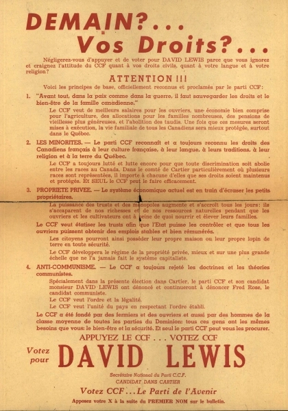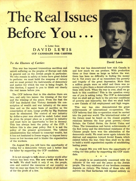 Lewis’ work in furthering Canada’s social democratic cause led to correspondence with political leaders and union heads involved in Montreal’s labour struggles. A fierce critic of communism, Lewis relied on his brief experience as a labour lawyer to encourage union members to transfer their support to social democracy. His Make This Your Canada: A Review of C.C.F. History and Policy (1943) was a surprisingly popular history of his party’s policy statements advocating for state control of the economy.