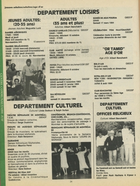 That same year, the Département francophone du ‘Y’ was renamed the Centre communautaire juif (CCJ). In 1979, Neighbourhood House moved its activities (including those of the CCJ) back to the Snowdon YM-YWHA. Working in conjunction with the athletic facilities at the “Y”, the CCJ was actively involved with Sephardic sports teams, competing in the Maccabi Youth Games (summer sporting competitions held in North America), and organizing the Sheleg Ski School, which was unique for operating on Sundays as opposed to Shabbat (Saturdays). It also facilitated a regular Oneg Shabbat (informal Friday night Sabbath get-together), attracting many Sephardic youth. The CCJ changed its name in 2003 to become the Services Communautaires de la CSUQ and continues to provide social, recreational and cultural services for the Sephardic community.