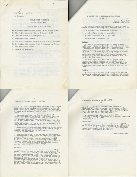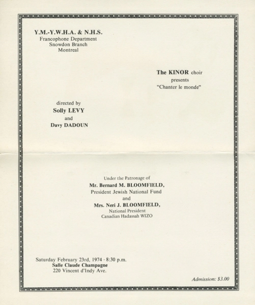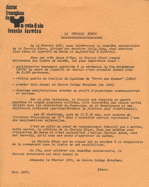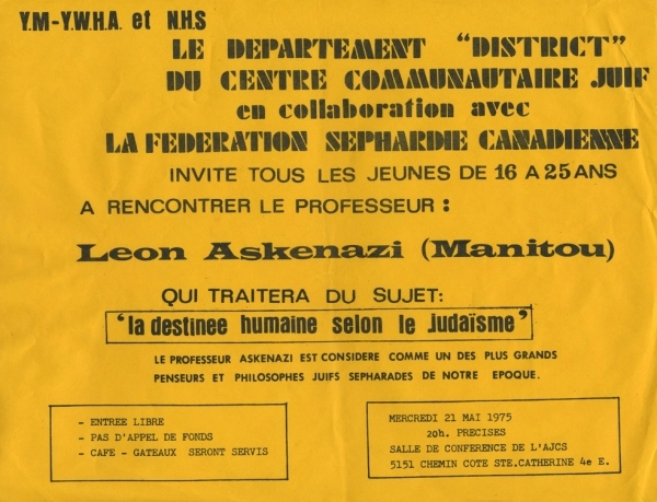 A cultural, social and recreational institution, the Département francophone du YM-YWHA was an example of newly immigrated Sephardic Jews’ attempts in the 1960s and 1970s to integrate into Montreal’s Jewish community on their own terms while affirming their unique cultural identity. Created with the help of a variety of other local Jewish organizations, it grew into the Centre communautaire juif and today’s Services Communautaires de la Communauté sépharade unifiée du Québec.