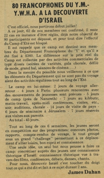 At the same time, the increasingly organized Sephardic community was pursuing its own homegrown initiatives. The Département francophone du ‘Y’ was created in 1968 as an initiative of l’Association sépharade francophone (predecessor of the Communauté sépharade unifiée du Québec [CSUQ]). It came at a critical juncture for the community, which saw over 5,000 Sephardic immigrants arrive in Montreal between 1967 and 1969. James Dahan, an early director of the Département francophone du ‘Y’, was aware of the social challenges facing Sephardic youth, many of whose parents were struggling to set up new lives in Montreal.