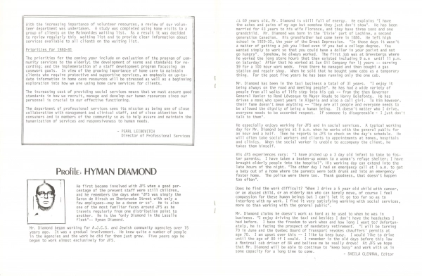 Over the years, JFS adapted to transformations in Quebec society and developments in the field of social work. As mental health, sex education, addiction, care of the elderly and other concerns were recognized as part of the mandate of a social service provider, JFS developed programs to respond to these needs. JFS’s professional work also included the supervision of many volunteer units (for example, Big Brothers, Big Sisters and hospital volunteers).