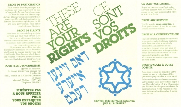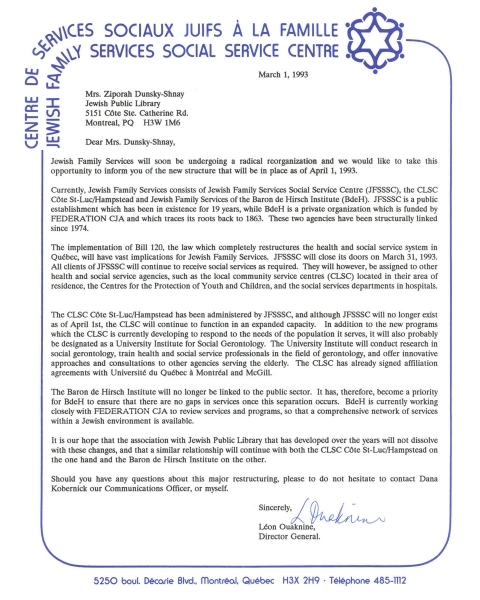 The public JFSSSC closed in 1993 in response to the Quebec government’s Bill 120 and the cessation of public funding. As a result, Jewish Family Services of the Baron de Hirsch Institute became a full-service, community-based organization. In 2008 Jewish Family Services of the Baron de Hirsch Institute merged with Jewish Immigrant Aid Society and Jewish Employment Montreal to become Ometz.