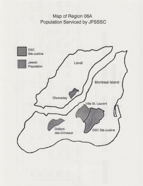 The Jewish Family Services Social Services Centre (JFSSSC) was opened in 1974 at 5250 Décarie as a public-funded agency, alongside the private JFS of the Baron de Hirsch Institute (located at Côte-Sainte-Catherine and Westbury). In 1971, Bill 65 gave the Quebec government control over the fragmented, private social and health services network in the province. After a series of task forces and public meetings, the Castonguay-Nepveu Commission recommended the establishment of three social service centres in Montreal; these became the Montréal Métropolitain serving primarily Francophones, the Ville Marie serving primarily Anglophones, and the JFSSSC serving primarily Jews. In accordance with provincial legislation, the JFSSSC became responsible for youth protection, young offenders, adoption and foster care (including group homes and placements for children, disabled adults and the elderly). The JFSSSC became the local service provider for the Département de santé communautaire (DSC) Ste. Justine, which covered the territory of Côte St. Luc and Hampstead in the 1980s and later included the Centre local de services communautaires (CLSC) Côte St. Luc/Hampstead.