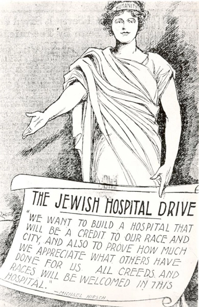 Cette caricature u00e9ditoriale publiu00e9e dans le u00abu00a0Montreal Daily Staru00a0u00bb le 23 septembre 1929 montre une du00e9esse qui symbolise lu2019humanitu00e9 et qui tient une affiche avec la citation de Monsieur Michael Hirsc, dans laquelle il mentionne la volontu00e9 de fonder lu2019Hu00f4pital gu00e9nu00e9ral juif. Monsieur Hirsch u00e9tait le co-pru00e9sident du u00abu00a0Committee of the Capital Campaignu00a0u00bb en 1929.