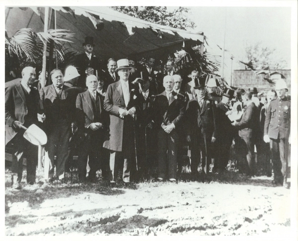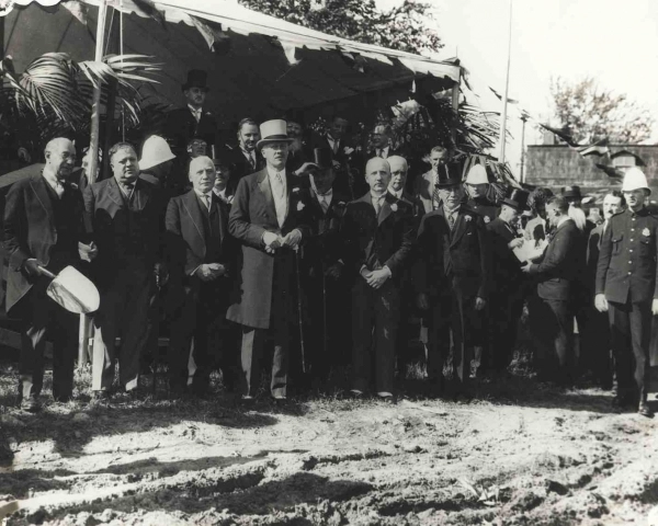 Portait de groupe avec Horace Cohen, Allan Bronfman, le rabbin Herman Abramowitz, le gouverneur gu00e9nu00e9ral Earl Bessborough et Joseph Levinson Sr., debout u00e0 cotu00e9 du2019une tente pour une cu00e9ru00e9monie de pelletu00e9e de terre, Hu00f4pital gu00e9nu00e9ral juif, Montru00e9al, 1932.