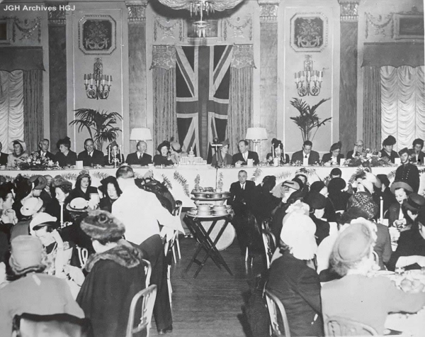 Un du00e9jeuner-gala offert par lu2019Hu00f4pital gu00e9nu00e9ral juif en lu2019honneur du2019Annie Goldbloom pour sa contribution et du00e9votion u00e0 la mise sur pied et au du00e9veloppement de l'Auxiliary, lors de sa retraite en tant que pru00e9sidente de lu2019Auxiliary en 1948. u00c0 partir de la troisiu00e8me personne u00e0 gaucheu00a0: A. H. Jassby, Mme Saidye Bronfman, Samuel Cohen, un nom inconnu, Allan Bronfman, Annie Goldbloom, Mme Hazel Lozinski, cinq nom inconnus, Michael Hirsch (troisiu00e8me u00e0 partir de la droite).