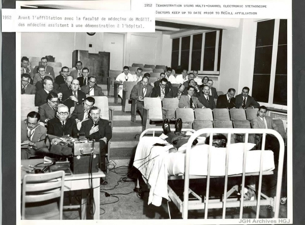 Des mu00e9decins restent u00e0 jour, avant lu2019affiliation u00e0 lu2019Universitu00e9 McGill, en assistant u00e0 une du00e9monstration du2019un stu00e9thoscope u00e9lectronique u00e0plusieurs canaux en 1952.