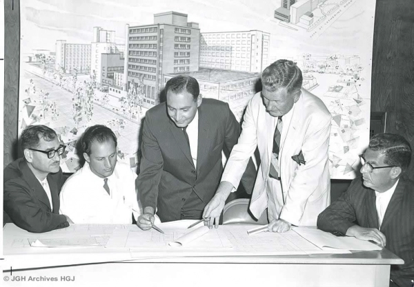 Cette photo montre les plans de construction de lu2019aile nord-ouest de lu2019Hu00f4pital gu00e9nu00e9ral juif. En arriu00e8re-plan, nous voyons les projets de ru00e9novations. De gauche u00e0 droiteu00a0: Dr Albert Lapin, cardiologue responsable; Dr M. J. Palayew, radiologue associu00e9; Archie Deskin, adjoint administratif et coordonnateur du projet de construction; Robert Fleming, architecte de lu2019entreprise Flemming et Smith et Dr Sydney Segall, cardiologue responsable du laboratoire cardiovasculaire, durant les annu00e9es 1960.