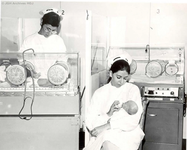Des infirmiu00e8res prenant soin de nouveaux nu00e9s dans l'aile nu00e9onatal de l'Hu00f4pital gu00e9nu00e9ral juif, vers les annu00e9es 1960.