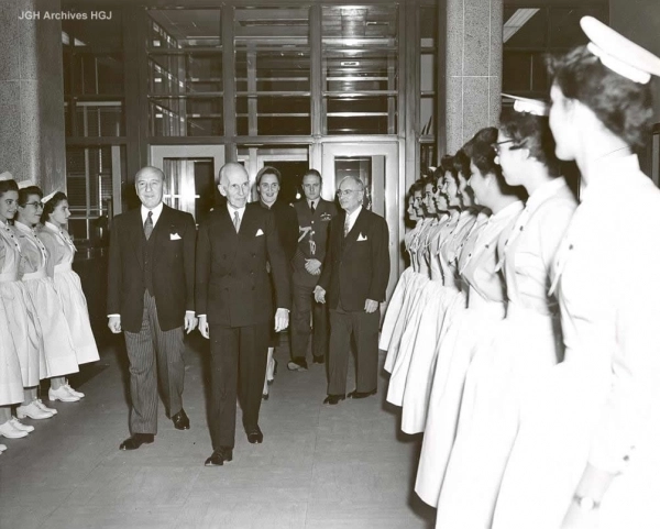 Des u00e9tudiantes en sciences infirmiu00e8res forment une haie du2019honneur devant lu2019entru00e9e de lu2019aile est de lu2019hu00f4pital en lu2019honneur de la visite du gouverneur gu00e9nu00e9ral Vincent Massey, que lu2019on voit marcher au premier-plan. Sont u00e9galement pru00e9sents Allan Bronfman (extru00eame gauche) et David Kirsch (extru00eame droite).
