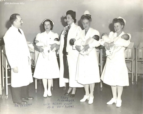 Le docteur George Strean (extru00eame gauche) accueille Dame Margaret Alexander (milieu) dans lu2019aile des nouveaux nu00e9s de lu2019Hu00f4pital gu00e9nu00e9ral juif. Dame Alexander, vicomtesse de Tunis et u00e9pouse du gouverneur gu00e9nu00e9ral du Canada, a visitu00e9 lu2019Hu00f4pital gu00e9nu00e9ral juif le 8 novembre 1947. Sur cette photo, elle porte une sarrau de chirurgiens et regarde trois groupes de jumeaux nu00e9s u00e0 lu2019Hu00f4pital et soignu00e9s dans la cru00e8che. Plus tard, elle dira que ce moment a u00e9tu00e9 son pru00e9fu00e9ru00e9 pendant la visite. Mademoiselle Amy Mendels, la surintendante des infirmiu00e8res est deuxiu00e8me u00e0 partir de la droite.