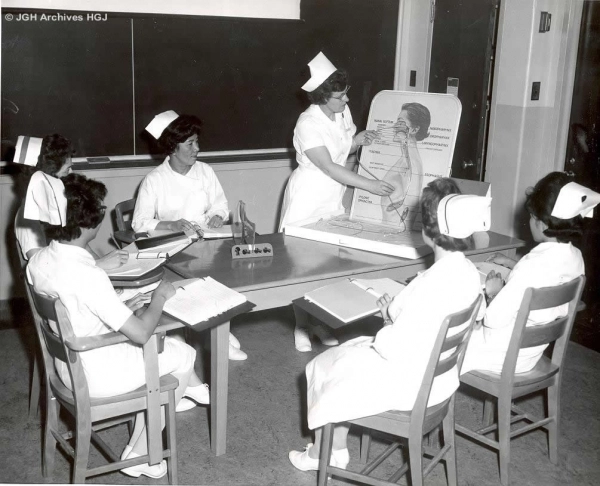 La premiu00e8re classe de bu00e9nu00e9voles du u00ab Women's Auxiliary u00bb en octobre 1959. Sur cette photo, les huit bu00e9nu00e9voles suivent une formation leur permettant d'allu00e9ger le travail non technique des infirmiu00e8res et autre personnel technique u00e0 l'hu00f4pital. Ces cours u00e9taient donnu00e9s par Madame L.I. Frochlich (debout), directrice des bu00e9nu00e9voles et une infirmiu00e8re autorisu00e9e. Ce programme a u00e9tu00e9 conu00e7u pour ru00e9duire la charge des soins non techniques du du00e9partement de soins infirmiers qui souffrait d'une pu00e9nurie de personnel.