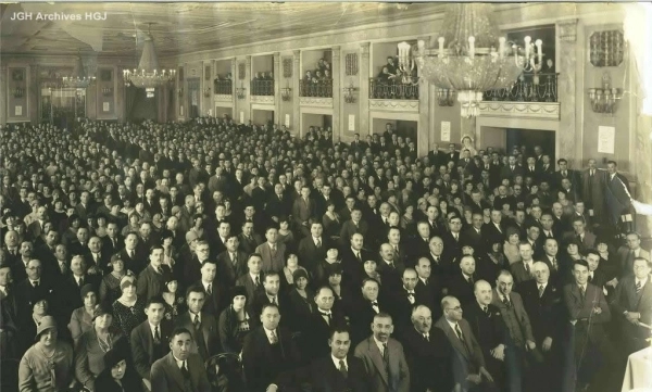 Photo d'une ru00e9union spu00e9ciale de citoyens, avec plus de 3000 personnes le 22 septembre 1929 u00e0 l'hu00f4tel Mont-Rpyal. Une campagne d'un million de dollars a u00e9tu00e9 inauguru00e9e par la communautu00e9 juive de Montru00e9al afin de recueillir des fonds et aller de l'avant avec les plans de construction de l'Hu00f4pital gu00e9nu00e9ral juif. Michael Hirsch, A.M. Vineberg, A.A. Jassby, Samuel Bronfman, Ald Louis Rubenstein, H.E. Herschorn, E.G.F. Vaz, I. Silverstone sont identifiu00e9s sur la photo.