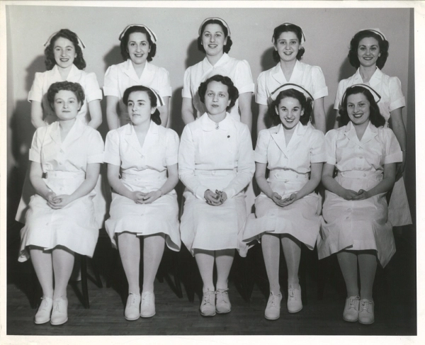 Photo de groupe des diplu00f4mu00e9s de l'u00c9cole des sciences infirmiu00e8res de l'Hu00f4pital gu00e9nu00e9ral juif, Montru00e9al, vers les annu00e9es 1950.