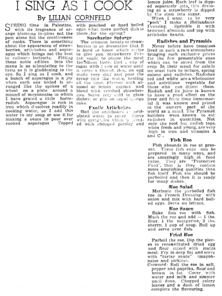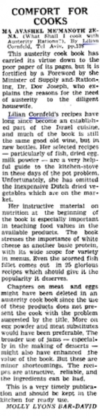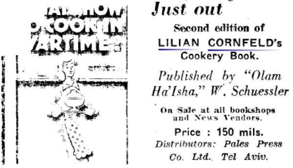 Though known for her bestselling cookbooks, Cornfeld also contributed articles and recipes to Ha’aretz , the Jerusalem Post and the Palestine Post . Her articles exemplify how women’s columns in Israeli newspapers played a critical role in the wartime efforts during the nation’s first few years of existence. Suggesting meals for husbands and sons both on duty and on leave, Cornfeld addressed the problem of insufficient variety and nutritious content in soldiers’ meals through the creation of a weekly menu for the military kitchen manager. Cornfeld’s creativity in adapting to often restrictive conditions is exemplified in her book, Ma avashel mimanot tzena (“What to Cook with the Austerity Portions”), published in 1949, which directly addressed the period of rationing that followed the founding of the state, through innovative recipes for eggless cakes and dishes using simple and easily accessible ingredients.