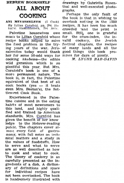 The very first complete cookbook in Modern Hebrew, published in 1948, was Cornfeld’s Ani mevashelet (“I Am Cooking”). Having supervised domestic science for WIZO (Women’s International Zionist Organization) and having worked as a food columnist and nutritional advisor, Cornfeld noted the challenges impeding the emergence of a national cuisine in Israel. These included its diverse composite populations (hailing from places as disparate as Russia and Yemen), the necessity for simplicity and austerity, and the absence of professional chefs. Ani mevashelet addressed the need to create a cuisine distinct to the young state, and is a compilation of recipes garnered from national and international organizations actively working to meet this objective.