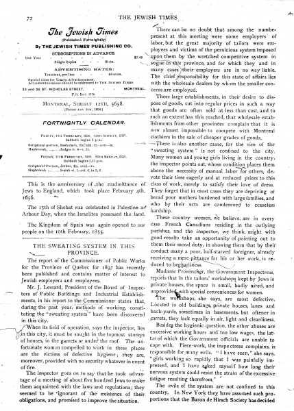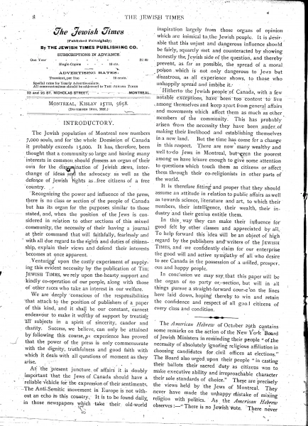 In 1897, Cohen and Samuel W. Jacobs founded the Jewish Times, the first English-language Jewish-interest newspaper in Canada. It was the newspaper of the establishment, promoting speedy Canadianization of recent East European arrivals and the acceptance of British customs. It was founded to counter the antisemitism spreading around the world, at the Dreyfus trial in France and in the fabricated Protocols of the Elders of Zion. It was also created to counter the customs of recently arrived East European Jews, which Cohen and his more assimilated uptowner associates considered to be among the root causes of that antisemitism. This belief system and desire to fit in with the Anglo-Protestant elite led to conservative and often bland journalism and a de-emphasis on Jewish nationalism. The Times was meant not only to inform the growing Montreal Jewish community of goings-on, but also to guide its readers into what the founders believed was the proper way of living and thriving in the New World.