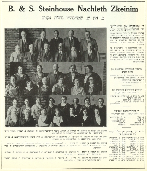 Le Montreal Hebrew Old People’s and Sheltering Home, nommé également Moshav Zkainim (Centre des aînés), a été fondée en 1910 par le rabbin Simon Glazer, un individu bien connu en raison de son dévouement à l’endroit de la communauté immigrante « downtowner. » À cette période, l’arrivée massive de Juifs de l’Europe de l’Est défavorisés a mis à l’épreuve les ressources de la communauté juive, et plusieurs organisations caritatives ont été fondées afin de venir en aide de ces nouveaux arrivants. Au départ, la Moshav Zkaihim hébergeait aussi les individus de passage et les enfants – l’organisation partageait alors ses locaux avec la Montreal Hebrew Orphans Home – et elle était située sur la rue Evans, soit au cœur du quartier immigrant juif. En plus de servir de centre pour aînés, l’institution offrait divers services : sociaux, dentaires, médicaux, religieux et récréatifs. En 1923, une deuxième résidence a été établie sur la rue de l’Hôtel-de-ville ; elle fut nommée d’après ses fondateurs, B. et S. Steinhouse. Une troisième résidence à brièvement existé sur la rue Cadieux (maintenant de Bullion) pendant les années 1920 nommé le Nachalus Zkainim Old People’s Home.