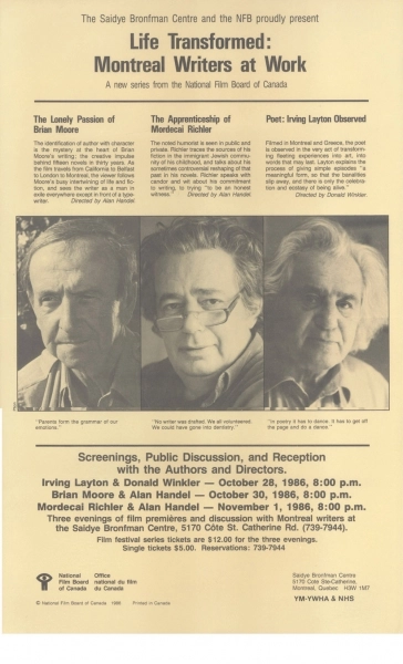 Richler survives in his widely-read works of fiction, most notably The Apprenticeship of Duddy Kravitz (1959), St. Urbain’s Horseman (1971), Joshua Then and Now (1980), Solomon Gursky Was Here (1989) and Barney’s Version (1997), and in the legacy of the Montreal Jewish community, from which his life and work cannot be disconnected. Richler described and defined the community for Canada and for the world and, whether he liked it or not, the community defined him, too.