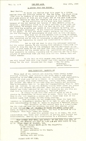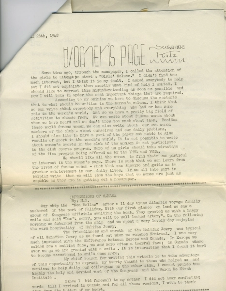 The New World Club was founded by two German Jews, Dr. Reichman and Dr. Pfeifer, who, upon arriving in Canada in 1940, were promptly interned by the Canadian government as German prisoners-of-war – tragically ironic, as their co-religionists were slaughtered by the same state they were accused of supporting. The men were released in 1943 once the government was convinced they were victims of the Nazi regime rather than collaborators. After the war, they set up the New World Club, which eventually had more than 200 members and served as a social club and immigrant aid organization. Members met for dances, lectures, poetry readings, and informal get-togethers. Many people met their future spouses and closest friends at such meetings. For some young adult survivors, their first years in Montreal, while challenging, were also exhilarating as they finally had an opportunity to socialize and have fun. The New World Club dissolved around 1951, having largely accomplished its goal of easing the transition for Holocaust survivors into their new communities, both in Montreal and in Canada as a whole. The New Canadian Club, which was run from within the YM-YWHA, existed only from 1947 to 1948. It published a magazine during this year, New Life, in English and transliterated Yiddish.