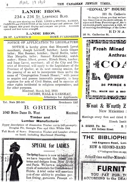 Tauben, Sara Ferdman. "Aspirations and Adaptations: Immigrant Synagogues of Montreal, 1880s-1945." Masters Thesis. Concordia University, 2004.