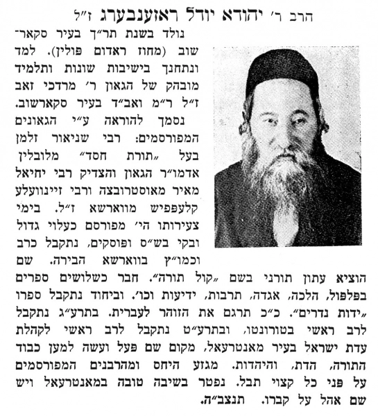 Rabbi Yudel Rosenberg, born in 1859 in the village of Skaryszew, Poland, received a traditional Hasidic education in literature and cabbalistic studies. In 1913, he emigrated to Toronto at the invitation of the Polish Jewish Congregation. When he arrived in Montreal in 1919, he became the Chief Rabbi of the United Hebrew Orthodox Congregations of Montreal, a coalition of synagogues serving immigrant Ashkenazi communities too impoverished to hire their own rabbis. Although exposed to lay ideas and interested in politics, economics and the sciences, Rosenberg adhered to an ultra-Orthodox interpretation of Judaism. Though he wrote extensively, his most significant contribution to the literature would become his translation from Aramaic to Hebrew of The Zohar, a classic work of Jewish mysticism. Rosenberg viewed the project as a first step toward a renewal of cabbalistic tradition. The translation represented his main contribution to the Hasidic community with which he was associated, and in which he neither assumed a traditional rabbinic role nor attracted followers.