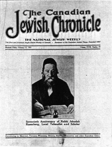 Rosenberg played an important role in Montreal’s kosher meet disputes (1923 to 1925). At a time when the community had lost control over this sector, he was invited to oversee the production of kosher meat. Meanwhile, Rabbi Hirsch Cohen led the foundation in 1922 of the Jewish Council of Montreal (Va’ad Ha-’ir), which was intended to provide strict supervision of the kosher diet. Conflict arose between Rosenberg and Cohen, leading to legal action that was settled only in 1925, when Rosenberg realigned himself with the Va’ad Ha-‘ir. Rosenberg served as Vice-Chair of the Rabbinical Council until his death in 1935. He was the grandfather of the prominent Montreal writer Mordecai Richler.