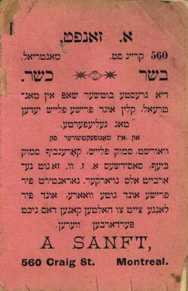 While Kravitz promoted himself as having introduced smoked meat to Montreal, Lovell’s Directory and newspaper ads reveal that Hyman Rees’ British-American Delicatessen Store (on St. Lawrence near Ontario) was dispensing smoked meat sandwiches in 1908, a few years prior to the establishment of Fanny’s Fruit and Candy Store. While Rees’ was the first sit-down delicatessen to sell smoked meat, a series of butchers were preparing smoked meat as early as the 1890s. Aaron Sanft, a butcher on Craig Street (now St-Antoine), was perhaps the first. Using a Romanian recipe, he promoted his American Sausage Factory’s smoked meat in an 1894 Jewish calendar.
