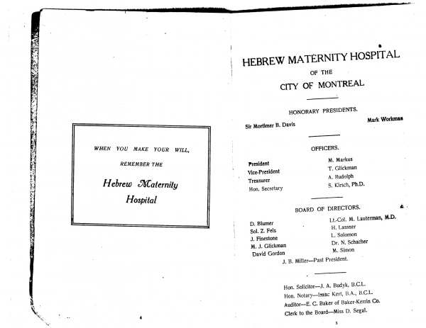 Le rapport annuel du Hebrew Maternity Hospital, 1919. Liste des membres du conseil du2019administration. u00a9 JGH Archives HGJ.