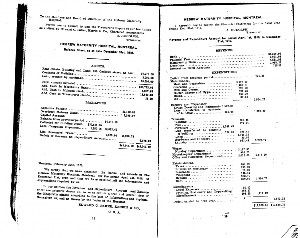Le rapport annuel du Hebrew Maternity Hospital, 1919. Rapport financier. u00a9 JGH Archives HGJ.