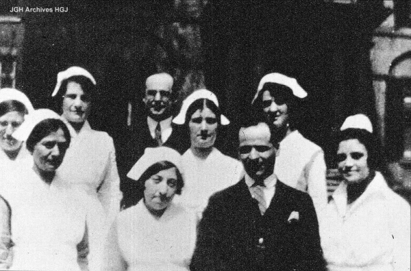 Des infirmiu00e8res et des mu00e9du00e9cins u00e0 lu2019extu00e9rieur du Hebrew Maternity Hospital en 1925. Le Hebrew Maternity Hospital a ouvert ses portes le 19 novembre 1916 afin du2019offrir des soins obstu00e9triques aux femme juives et non-juives. Le Hebrew Maternity Ward et le Herzl Dispensary ont u00e9tu00e9 des pru00e9curseurs du Jewish General Hospital et ont u00e9tu00e9 fondu00e9s en grande partie gru00e2ce aux efforts de Taube Kaplan. Lu2019hu00f4pital u00e9tait situu00e9 sur la rue Cadieux (maintenant de Bullion). Dans la photo : le docteur F. Bernstein (en avant), le docteur I.B. Hirshberg (derriu00e8re), infirmiu00e8res inconnues. u00a9 JGH Archives HGJ. ID No: OF5.9.1.1