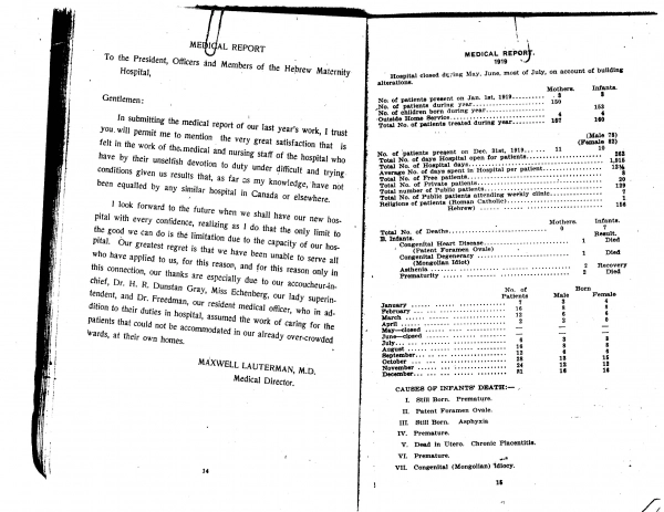 Le rapport annuel du Hebrew Maternity Hospital, 1919. Du00e9but du rapport mu00e9dical. u00a9 JGH Archives HGJ.
