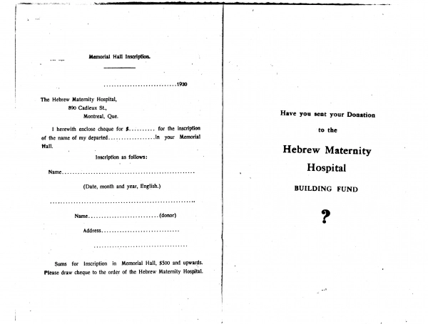 Le rapport annuel du Hebrew Maternity Hospital, 1919. Formulaire de don. u00a9 JGH Archives HGJ.