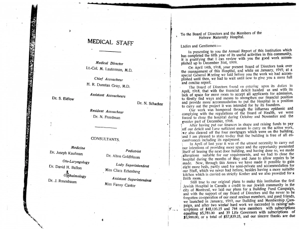 Le rapport annuel du Hebrew Maternity Hospital, 1919. Liste du personnel mu00e9dical. Du00e9but du rapport du pru00e9sident. u00a9 JGH Archives HGJ.