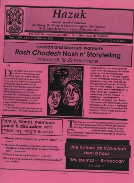 Le 30 juillet 1992, Yakhdav est officiellement constitué. Non seulement il s’agissait d’une institution qui facilitait les rencontres entre les juifs LBGTQ+ de Montréal, Yakhdav produit aussi un bulletin mensuel appelé Hazak. Le slogan de leur lettre d’information s’inspirait de la pratique utilisée pour conclure la lecture d’un livre de la Torah : « sois fort, sois fort, et renforçons-nous les uns les autres. » Ce bulletin offrait un espace pour la couverture des événements communautaires tels que les fêtes de Hanoukka ou des soirées de jeux de société aux café Passez-Go sur St. Laurent. Les pages d’Hazak servait d’espace pour discuter des environements de travail sûrs pour les LGBTQ+, affichant des listes d’offres d’emploi ainsi que les possibilités de réseautage à Montréal, comme les associations professionnelles lesbiennes ou bisexuelles. Le bulletin a également fait la promotion du Prix arc-en-ciel, un événement célébrant les talents des lesbiennes, des bisexuels et des gays du Québec en plus d’offrir des recommandations des films d’intérêt pour leurs lecteurs, comme Oy Gay et Tomboychik.